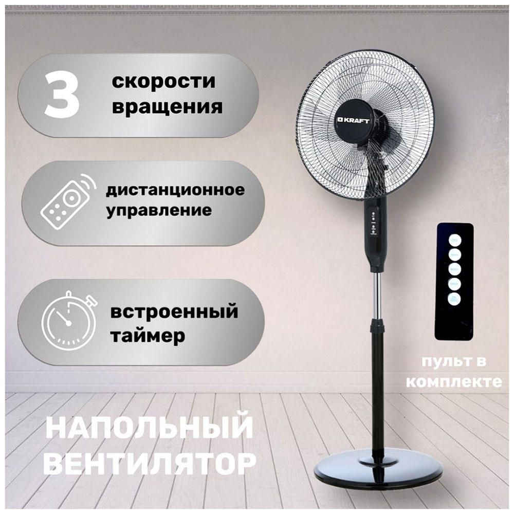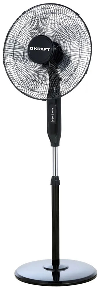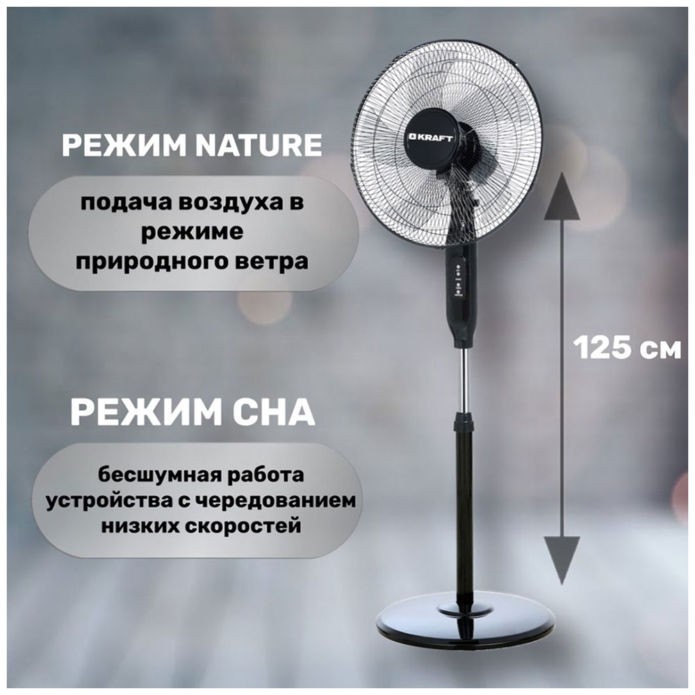 У прибора три скорости работы. Вентилятор оснащен таймером, который программируется до 450 минут. По истечении заданного времени вентилятор выключится автоматически. Также KRAFT KF-FS55-16BLTR оснащен двумя режимами: в режиме NATURE устройство функционирует автоматически, изменяя скорость для имитации ветра. В режиме сна вентилятор работает бесшумно, чередуя низкие скорости.