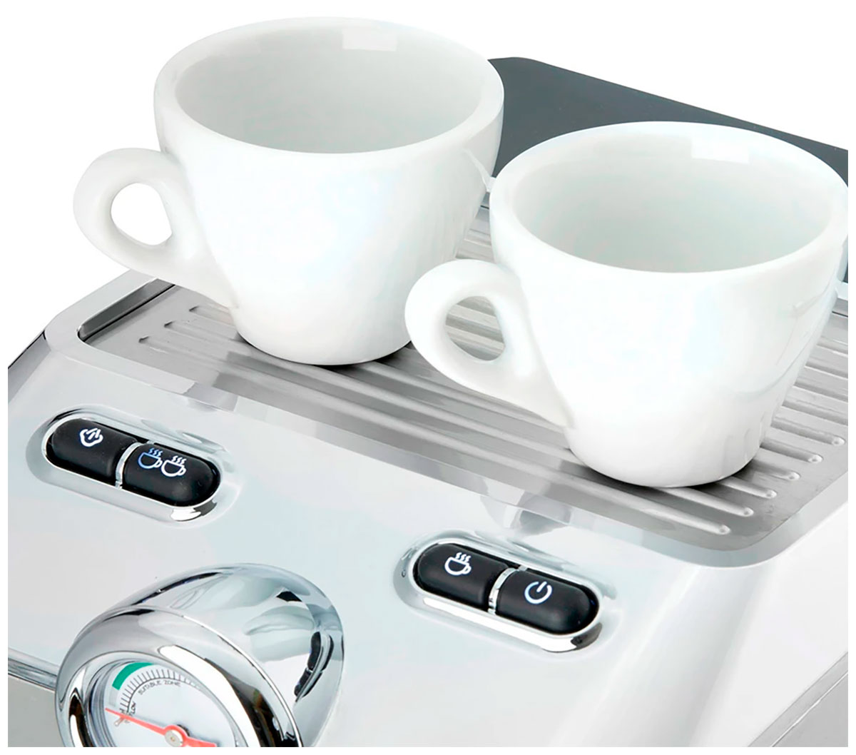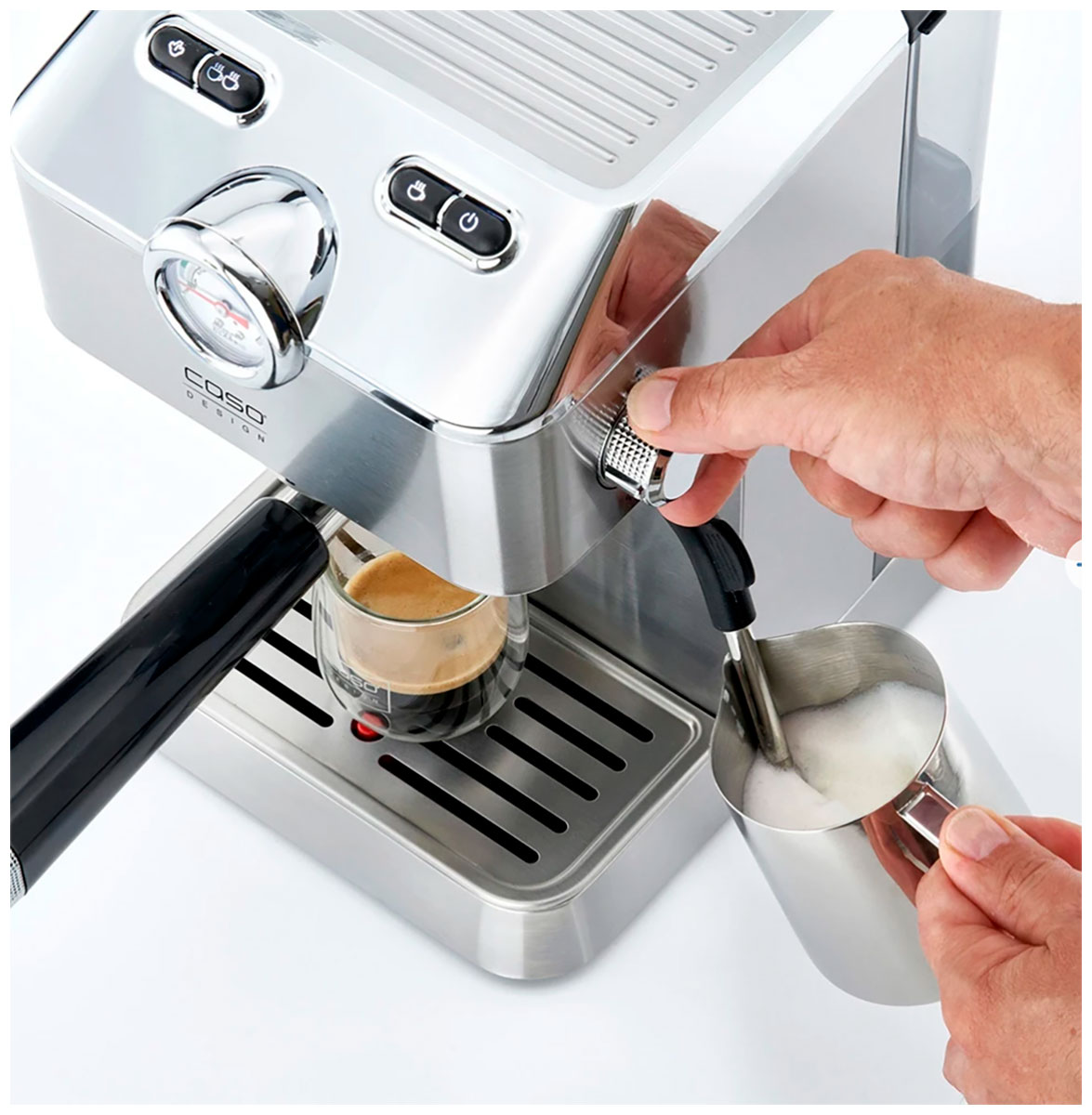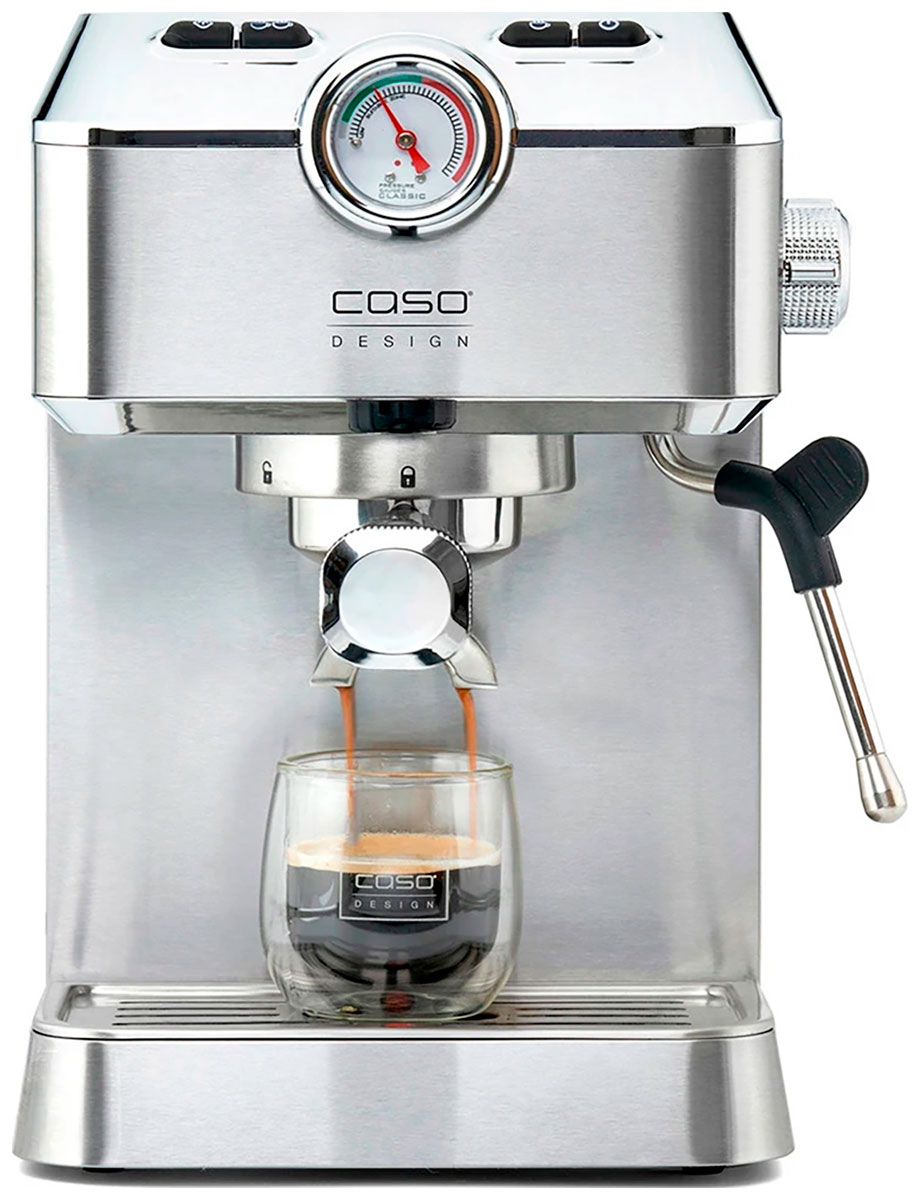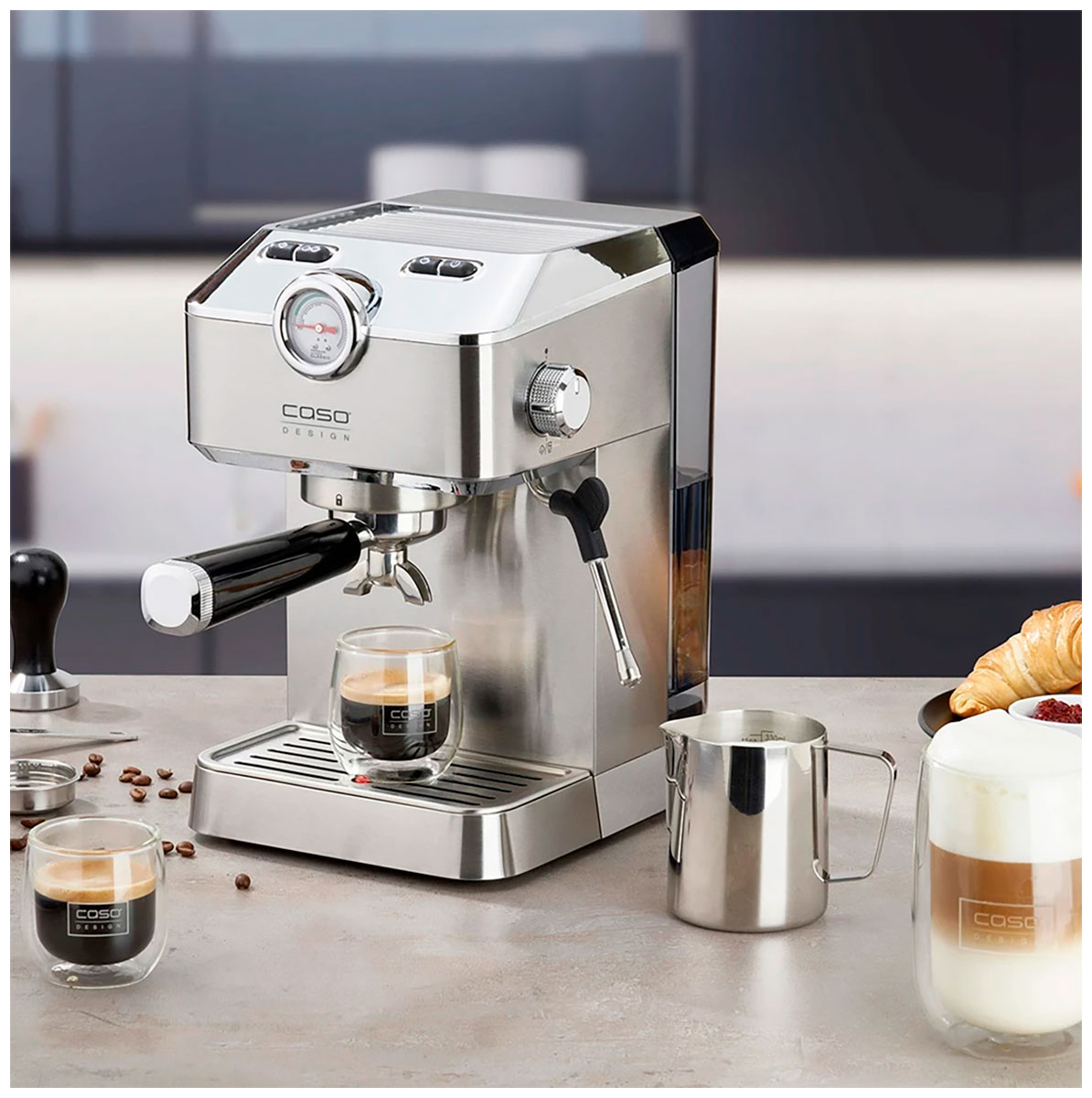 Кофеварка CASO Espresso Gourmet используется в отелях, офисах, частных домах и квартирах для приготовления эспрессо и других кофейных напитков на основе эспрессо. Модель оснащена 4 сенсорными кнопками с подсветкой, портафильтром, встроенным держателем для чашек с подогревом, съемными резервуаром для воды и поддоном для сбора капель. Корпус, портафильтр, паровая трубка, поддон, фильтры-вставки, мерная ложка и молочник выполнены из нержавеющей стали.