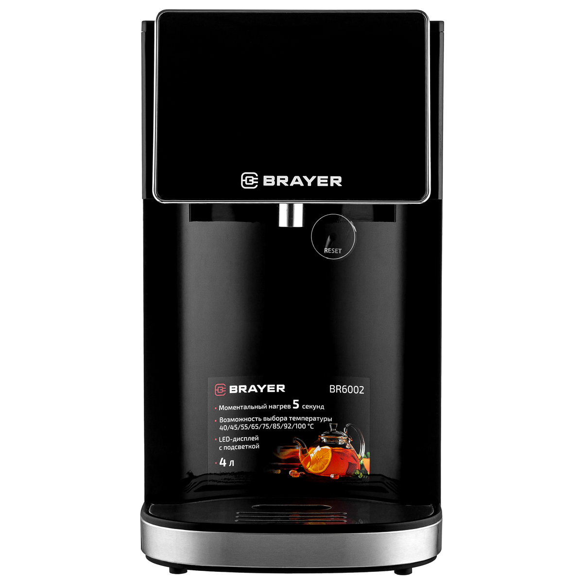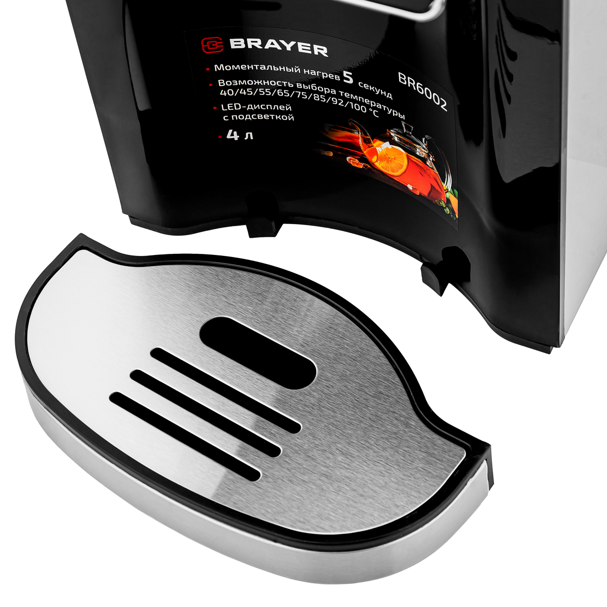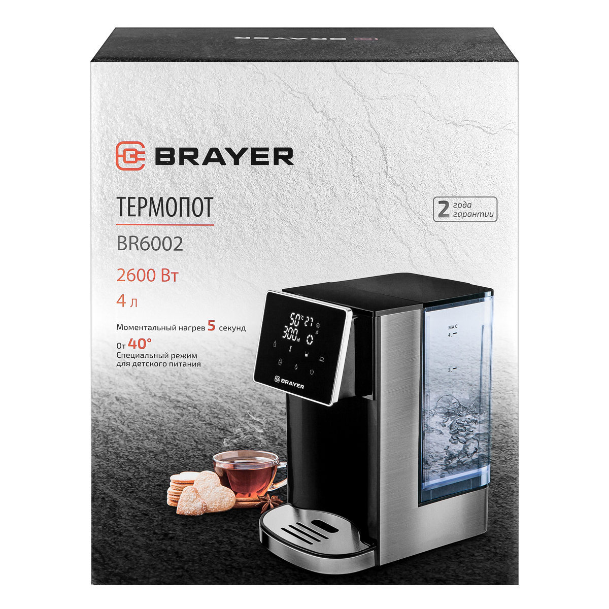 Термопот BRAYER BR6002 работает в восьми режимах для кипячения сырой воды и подогрева до нужной температуры. Дисплей показывает текущую температуру, выбранный режим, активные блокировки и прочие рабочие индикаторы. Мерная шкала на емкости помогает контролировать уровень оставшейся в термопоте воды. Есть система защиты от перегрева и программа самоочистки от накипи.