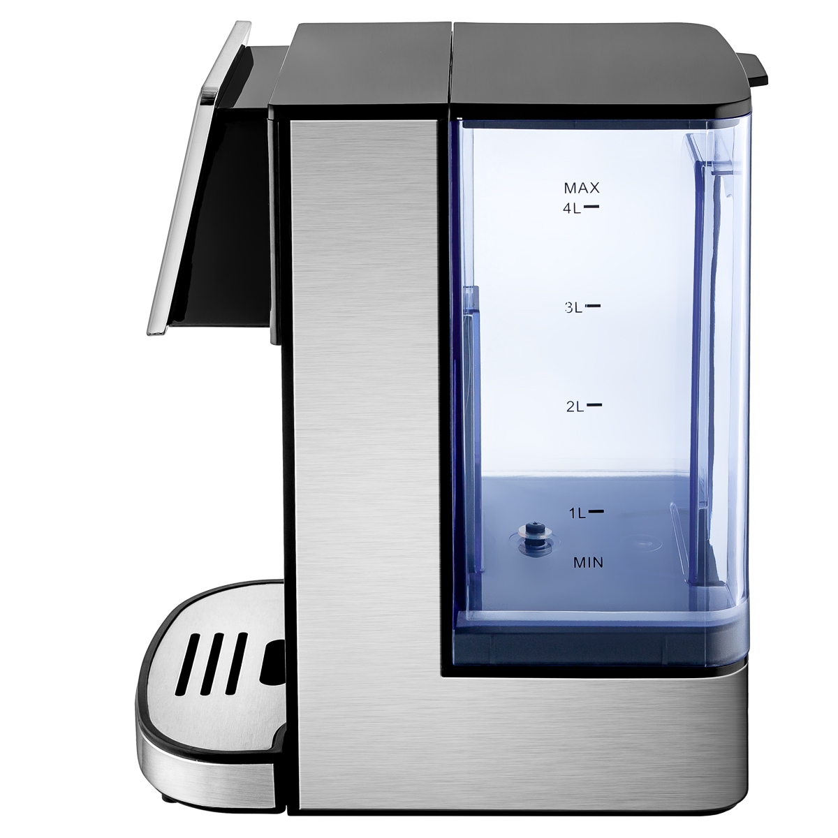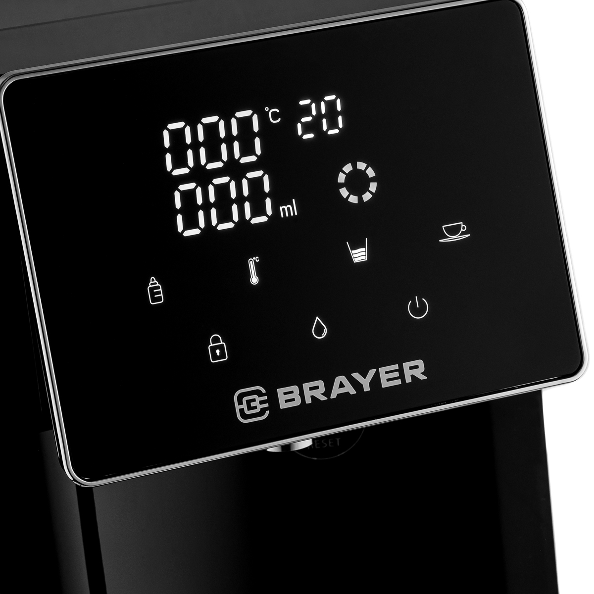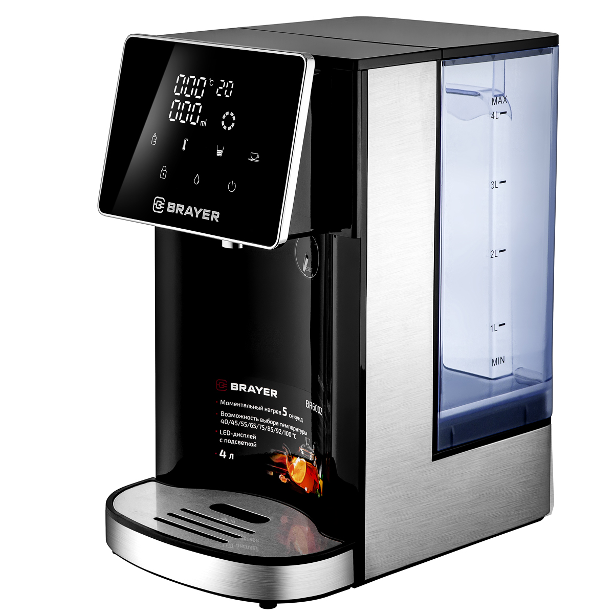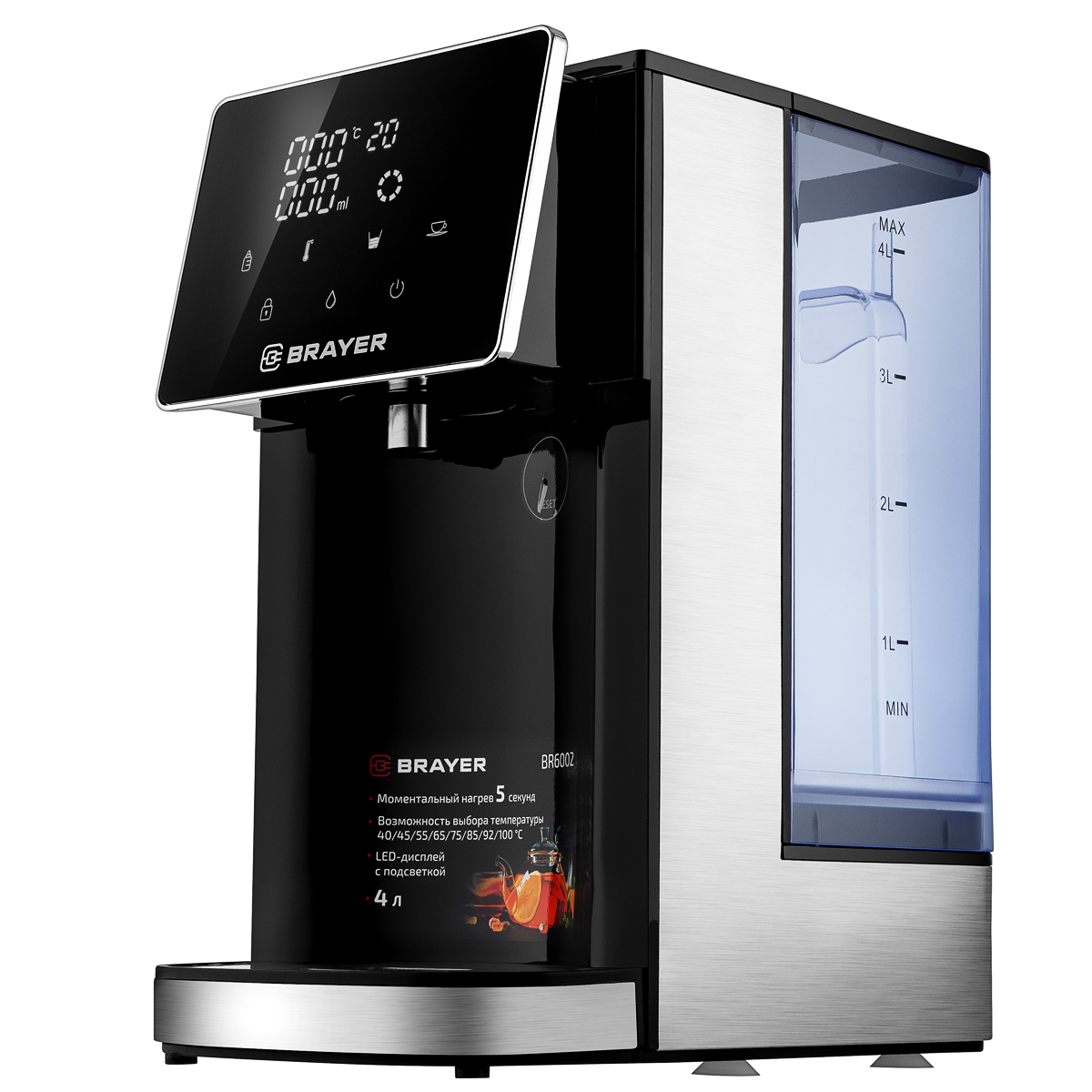 Термопот BRAYER BR6002 работает в восьми режимах для кипячения сырой воды и подогрева до нужной температуры. Дисплей показывает текущую температуру, выбранный режим, активные блокировки и прочие рабочие индикаторы. Мерная шкала на емкости помогает контролировать уровень оставшейся в термопоте воды. Есть система защиты от перегрева и программа самоочистки от накипи.