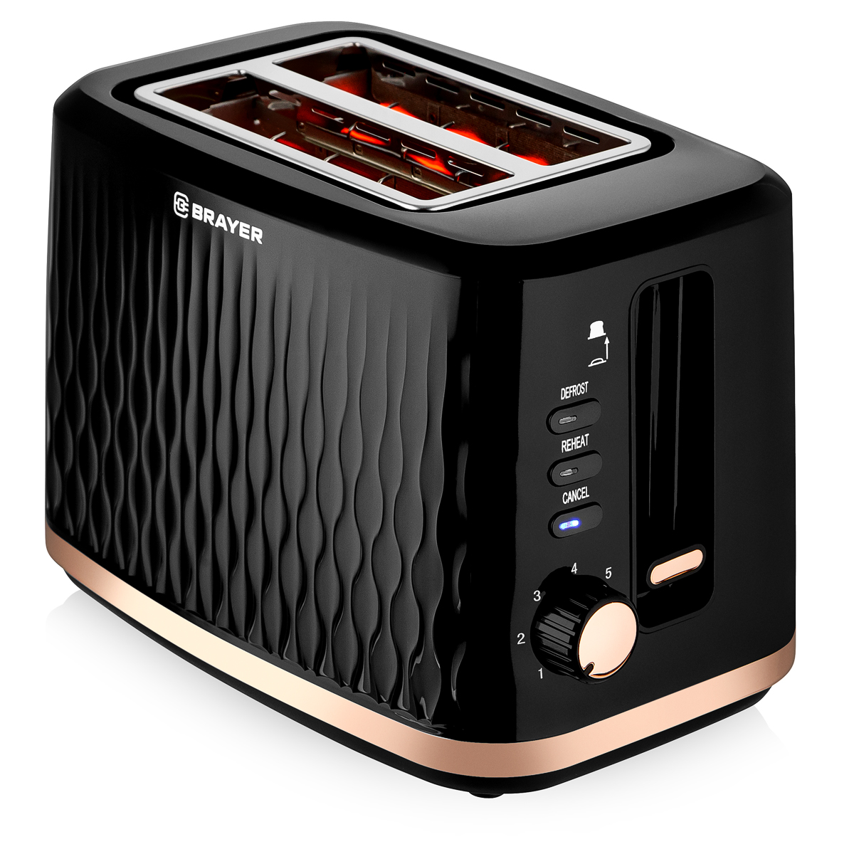 Когда заданный цикл завершается, прибор отключается и тосты выталкиваются вверх. На панели управления Brayer BR2105 расположены кнопки для отмены приготовления, активации функций разморозки и подогрева. Съемный поддон для сбора крошек поддерживает чистоту столешницы. Его можно снимать при необходимости очистки.