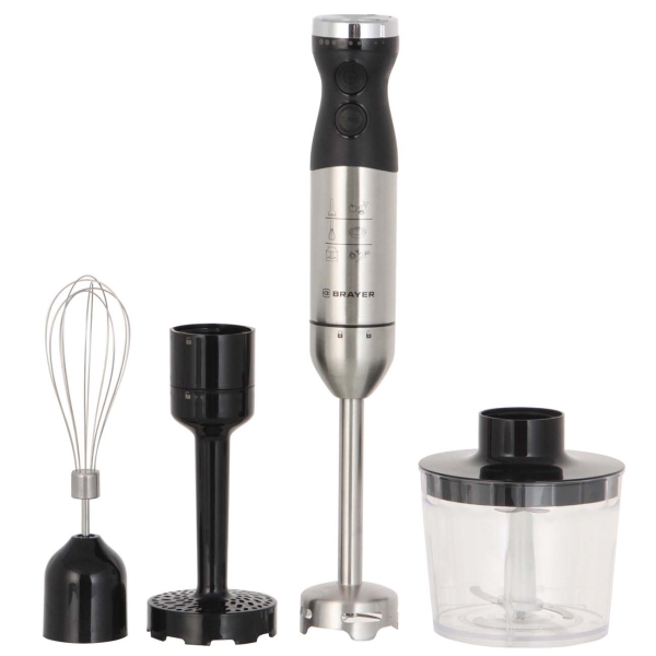 Прибор BRAYER BR1244 поставляется с мерным стаканом, измельчителем с емкостью на 500 мл, насадками в виде блендера, для взбивания и приготовления картофельного пюре. Устройство весит 2 кг и обладает размерами 20x30x20 см. С помощью блендера проводить кулинарные эксперименты проще и удобнее.